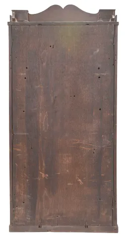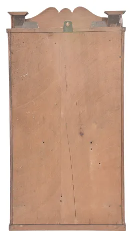 (1) Mahogany and birds eye case in an old finish has veneer loss on the base, repairs on the two chimneys and some loss near the cross strip. Mirror is a replacement. Alarm dial is in poor condition and is most likely original to the clock as there is evidence that an alarm bell was behind the splat. The current movement does not have an alarm. Period hands. Top glass is missing. Dark label inside. (2) Refinished mahogany veneered case has couple repairs on the door and cross strip. Original dial is in very nice condition. Original hands and mirror. Clean label inside.