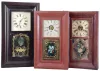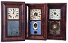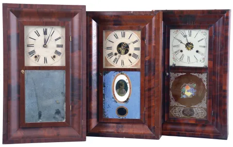 (1) Mahogany veneered case in original finish. Painted dial and hands are a replacement. Original tablet has scattered loss; (2) Mahogany veneered case now painted in a shade of red with gold paint inlay. Dial is a replacement. Hands and tablet are replacements. Partial label inside. (3) Mahogany veneered case in an old finish has some roughness to the veneer on the outer band. Original painted has age darkened with some scattered loss and stains. Original tablet has scattered loss. Original hands. Slightly dark label inside. (4) Mahogany veneered case in an old finish has had some minor repairs. Original painted dial has some minor wear to the numbers. Original mirror is broken. Hands are period and look original. Clean label inside. (5) Mahogany veneered case in an old finish has minor veneer loss on the bottom of the outer band. Original painted dial has some minor paint loss and original hands. Tablet looks original with scattered loss. Clean label inside. (6) Mahogany veneered case in original finish has a small chip at one corner. Original painted dial has some wear to the numbers and some loss at the mounting pins. Original hands and tablet. Fairly clean label inside.