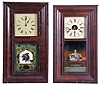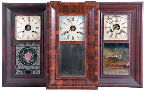 Clocks- 8 (Eight): (1) Ansonia Brass Co., Ansonia, Conn., 30 hour, time and strike, weight brass movement OG shelf clock, c1860; (2) Waterbury Clock Co., Waterbury, Conn., 30 hour, time and strike, weight brass movement OG shelf clock, c1860 (3) Chauncey Goodrich, Bristol, Conn., 30 hour, time and strike, weight brass movement OG shelf clock, c1852 (4) Terry & Andrews, Bristol, Conn., 30 hour, time and strike, weight brass movement OG shelf clock, c1845 (5) William S. Johnson, New York, 30 hour, time and strike, weight brass movement OG shelf clock, c1845 (6) Unknown, "46 Courtland St", New York, 30 hour, time and strike, weight brass movement OG shelf clock, c1850 (7) Forestville Mfg. Co., Forestville, Conn., 8 day, time and strike, weight brass movement OG shelf clock, c1850 (8) Jerome & Co., New Haven, Conn., 8 day, time and strike, weight brass movement OG shelf clock, c1870 (1) Rosewood veneered case in original finish has some loss on the outer band. Original painted dial is soiled with some wear. Original hands and tablet with scattered background loss. Dark label inside; (2) Refinished rosewood veneered case has small repairs on the bottom outer band. Original painted dial is in nice condition for its age. Original hands and mirror. Clean label inside. (3) Mahogany veneered case in original finish has small piece missing on outer band. Original painted dial has scattered loss. Original hands and tablet with scattered loss. Clean dial inside. (4) Refinished mahogany veneered case has minor loss on the outer band. Original painted dial is clean. Replaced hands. Original tablet has some loss to the frosted areas. (5) Mahogany veneered case, lacking finish, with some loss on the bottom outer band, the case sides and the door. Original painted dial is fairly clean for its age. Replaced minute hand. Cracked original tablet. Top glass is missing. Dark stained label inside. (6) Refinished mahogany veneer case has veneer loss on the outer band with some lifting on the OG molding. Period painted dial is most likely a replacement as it has plugged screw holes. Original tablet is pretty much gone. Gong base is missing. Replaced hands. (7) Mahogany and rosewood veneered case has some loss in places on the outer band. Original painted dial has scattered loss and some paint lifting. Hands are old, but may be replaced. Original tablet has some loss in the center area. Dark label inside. (8) Mahogany veneered case has some damage on the outer band, on the lower left corner OG molding and on the door. Replaced dial and hands. Original tablet has scattered loss. Dark label inside.