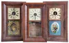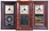 (1) Rosewood veneered case in original finish has some loss on the outer band. Original painted dial is soiled with some wear. Original hands and tablet with scattered background loss. Dark label inside; (2) Refinished rosewood veneered case has small repairs on the bottom outer band. Original painted dial is in nice condition for its age. Original hands and mirror. Clean label inside. (3) Mahogany veneered case in original finish has small piece missing on outer band. Original painted dial has scattered loss. Original hands and tablet with scattered loss. Clean dial inside. (4) Refinished mahogany veneered case has minor loss on the outer band. Original painted dial is clean. Replaced hands. Original tablet has some loss to the frosted areas. (5) Mahogany veneered case, lacking finish, with some loss on the bottom outer band, the case sides and the door. Original painted dial is fairly clean for its age. Replaced minute hand. Cracked original tablet. Top glass is missing. Dark stained label inside. (6) Refinished mahogany veneer case has veneer loss on the outer band with some lifting on the OG molding. Period painted dial is most likely a replacement as it has plugged screw holes. Original tablet is pretty much gone. Gong base is missing. Replaced hands. (7) Mahogany and rosewood veneered case has some loss in places on the outer band. Original painted dial has scattered loss and some paint lifting. Hands are old, but may be replaced. Original tablet has some loss in the center area. Dark label inside. (8) Mahogany veneered case has some damage on the outer band, on the lower left corner OG molding and on the door. Replaced dial and hands. Original tablet has scattered loss. Dark label inside.