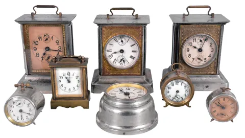 Clocks- 8 (Eight) Novelty and Musical Alarm Clocks: Clocks include models by Seth Thomas, New Haven, Waterbury, Sprague & Co., and Junghans. Standouts include a Waterbury "Hornet" 30 hour novelty timepiece and a small repeating "Kenwick" carriage clock by