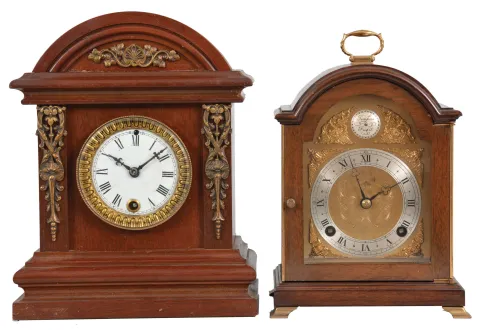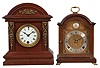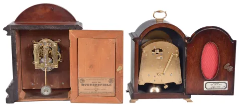 Clocks- 2 (Two) Mantel: (1) Ansonia Clock Co., New York, "Huddersfield" cabinet clock, 8 day, time only, spring-driven movement in a mahogany case with brass trimmings and white enamel dial, c1894; (2) F.W. Elliot, Croyden, England for Shreve, Crump & Low