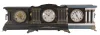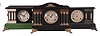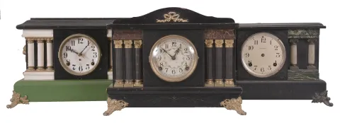 Clocks- 7 (Seven) Mantel: 8 day, time and strike, spring driven black painted wood mantel clocks by makers such as Sessions, Ingraham, and Waterbury. Also included is a French mantel clock with mahogany case, white enamel dial, and Japy Freres movement.