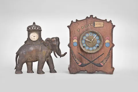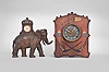 Clocks- 2 (Two): (1) Golden Novelty Mfg. Co., Chicago, elephant novelty clock, 30 hour, time only, spring driven balance wheel movement in a cast iron case shaped like an elephant, c1895; (2) Wm. L. Gilbert Clock Co., Winsted, Conn., "Cosey Corner,