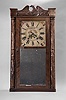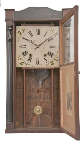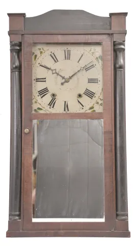 Clocks- 2 (Two): (1) Unknown, 30 hour, time and strike weight wood movement carved column & splat shelf clock. c1832 (2) Elisha Hotchkiss, Burlington, Conn., 30 hour, time and strike weight wood movement half column & splat shelf clock. c1835 (1) Mahogany veneered case has veneer loss and repairs on the door. Painted dial has scattered loss and wear. Original hands. Some restoration to the carved eagle. A Rodney Brace backboard from a different clock has been added to this case. (2) Mahogany veneered case in an old finish has veneer loss on the base and one side return. Original painted dial has some wear and loss at the winding arbors. Original hands. Replaced mirror. Dark label with some loss.
