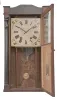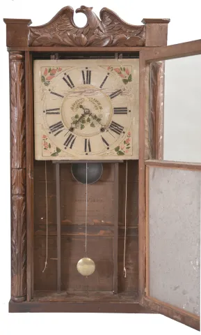 (1) Mahogany veneered case has veneer loss and repairs on the door. Painted dial has scattered loss and wear. Original hands. Some restoration to the carved eagle. A Rodney Brace backboard from a different clock has been added to this case. (2) Mahogany veneered case in an old finish has veneer loss on the base and one side return. Original painted dial has some wear and loss at the winding arbors. Original hands. Replaced mirror. Dark label with some loss.