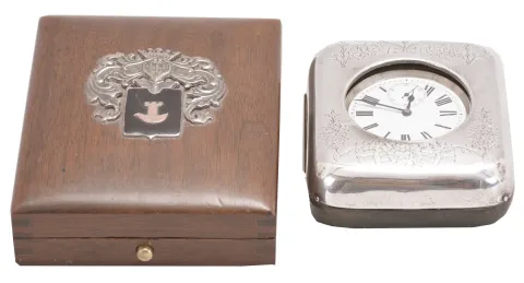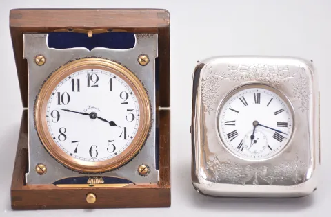 Travel clocks- 2 (Two): the first marked "Barbezat Swiss", 15 jewel, quarter repeating cotes de Geneve decorated nickel movement with arabic numeral white enamel dial, mounted to a folding sterling silver plate and hinged to a mahogany box, the top with
