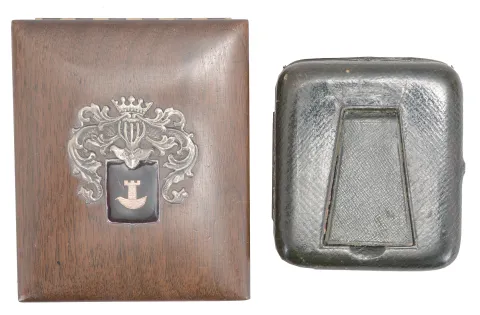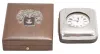 Travel clocks- 2 (Two): the first marked "Barbezat Swiss", 15 jewel, quarter repeating cotes de Geneve decorated nickel movement with arabic numeral white enamel dial, mounted to a folding sterling silver plate and hinged to a mahogany box, the top with applied foliate ornament surrounding a knight's mask and crown, above an oblong enamel panel set with a gold castle tower ornament, the other with 7 jewel Swiss movement marked "Venta", roman numeral white enamel dial, and silver open face case, contained in an easel back, leather clad, velvet lined box, the front mounted with sterling silver and engraved with floral drops, garlands, and bow knots, with London hallmark, and date letter for the year 1908 Barbezat running and striking, striking with some errors, will need attention, box good, with minor wear and dirt, Venta will tick briefly, small chip in dial at 6:00, box good with minor wear