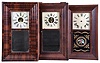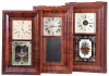 (1) Mahogany and rosewood veneered case in original finish in nice condition. Original painted dial has minor loss at the mounting pins and a circular scratch. Original tablet has scattered loss. Original hands. Dark label inside; (2) Rosewood and mahogany veneered case in an old finish has some small loss on the outer band. Original painted dial has some loss on the left side. Original tablet and hands. Dark label inside. (3) Refinished mahogany and rosewood veneered case has some repairs and loss on the outer band and the sides bottom edge. Replaced dial. Period hands. Nice Fenn tablet has scattered loss. Clean label inside. (4) Refinished rosewood veneered case has some minor loss at the outer band corners. Original painted dial has minor wear at the winding arbors. Original hands and mirror. Clean label inside. Lock is not attached in the door, but is included with the pendulum. (5) Refinished mahogany veneered case in nice condition. Replaced dial and tablet. Original hands. Clean label inside. (6) Refinished rosewood veneered case has some minor loss on the outer band. Original painted dial has minor wear and loss at the mounting screws and winding arbors. Original hands. Replaced mirror. Clean label inside. (7) Refinished mahogany veneered case has some veneer damage on the lower right side. Repainted original dial. Original hands and mirror. (8) Refinished mahogany veneered case has minor damage at the top outer band. Original painted has some minor loss at the mounting pins. Replaced tablet. No hands or gong.