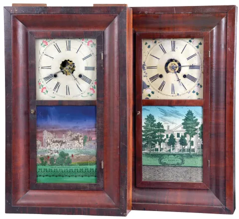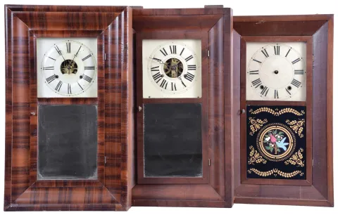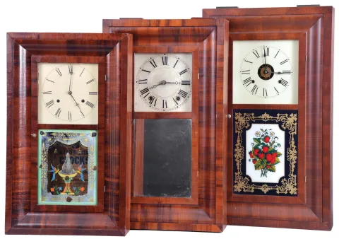 Clocks- 8 (Eight): (1) New Haven Clock Co., New Haven, Conn., 30 hour, time and strike, weight brass movement OG shelf clock, c1860; (2) Bristol Brass and Clock Co., Bristol, Conn., 30 hour, time, strike and alarm weight brass movement OG shelf clock, c1850 (3) William L. Gilbert, Winchester, Conn., 30 hour, time and strike, weight brass movement OG shelf clock, c1842 (4) H. Sperry, New York, 30 hour, time and strike, weight wood movement OG shelf clock, c1840 (5) Seth Thomas Clock Co., Thomaston, Conn., 8 day, time, strike and alarm weight brass movement OG shelf clock, c1870 (6) E. C. Brewster & Son, Bristol, Conn., 30 hour, time and strike, weight brass movement OG shelf clock, c1855 (7) Atkins, Porter & Co., Bristol, Conn., 30 hour, time and strike, weight brass movement OG shelf clock, c1843 (8) Hotchkiss & Fields, Burlington, Conn., 30 hour, time and strike, weight wood movement bevel case shelf clock, c1845 (1) Mahogany and rosewood veneered case in original finish in nice condition. Original painted dial has minor loss at the mounting pins and a circular scratch. Original tablet has scattered loss. Original hands. Dark label inside; (2) Rosewood and mahogany veneered case in an old finish has some small loss on the outer band. Original painted dial has some loss on the left side. Original tablet and hands. Dark label inside. (3) Refinished mahogany and rosewood veneered case has some repairs and loss on the outer band and the sides bottom edge. Replaced dial. Period hands. Nice Fenn tablet has scattered loss. Clean label inside. (4) Refinished rosewood veneered case has some minor loss at the outer band corners. Original painted dial has minor wear at the winding arbors. Original hands and mirror. Clean label inside. Lock is not attached in the door, but is included with the pendulum. (5) Refinished mahogany veneered case in nice condition. Replaced dial and tablet. Original hands. Clean label inside. (6) Refinished rosewood veneered case has some minor loss on the outer band. Original painted dial has minor wear and loss at the mounting screws and winding arbors. Original hands. Replaced mirror. Clean label inside. (7) Refinished mahogany veneered case has some veneer damage on the lower right side. Repainted original dial. Original hands and mirror. (8) Refinished mahogany veneered case has minor damage at the top outer band. Original painted has some minor loss at the mounting pins. Replaced tablet. No hands or gong.