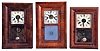 (1) Refinished mahogany veneered case has small repairs on the outer band corners and some loss on the door. Replaced dial and hands. Original mirror; (2) Refinished rosewood veneered case has some small veneer repairs at the out band corners. Original painted dial is in nice condition. Bottom glass now clear. Minute hand missing. Stained label. (3) Partially refinished mahogany veneered case has original finish on the OG molding. Original painted dial has some loss at 3 o'clock. Original hands. Replaced tablet. Dark stained label inside. (4) Refinished mahogany veneered case has poor repairs on the outer band and the door. Original painted dial in nice condition. Replaced hands and tablet. Dark label inside. (5) Refinished mahogany veneered case has repairs and rough veneer on the outer band and one place on the door. Original painted dial has age darkened. One of the keyhole grommets is missing. Original hands and mirror. Dark stained label inside. (6) Mahogany veneered case in an old finish has small repairs on the door corners and some loss. Painted dial is a replacement as the current dial has plugged holes. Doorknob is missing and the bottom glass is now clear. Dark labels inside. (7) Mahogany and rosewood veneered case in an old finish has minor loss on the outer band corners, a repair and damage on the door. Original painted dial is soiled around the winding arbors. Original hands and tablet. Dark label inside. (8) Rosewood veneered case in an old finish has a small chip on the bottom left corner. Original painted dial has some scattered paint loss. Hands are not original. Bottom glass now clear.