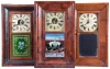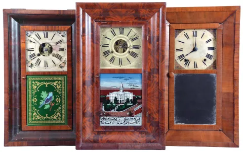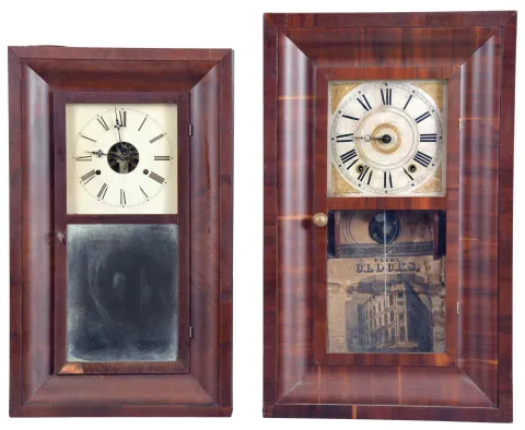 Clocks- 8 (Eight) : (1) Clark, Gilbert & Co.,Bristol, Conn., 30 hour, time and strike, weight brass movement OG shelf clock, c1841; (2) Smith & Brothers, New York, 30 hour, time and strike, weight wood movement OG shelf clock, c1840 (3) Morse & Co., Plymouth Hollow, Conn., 30 hour, time and strike, weight brass movement OG shelf clock, c1855 (4) Hotchkiss & Fields, Burlington, Conn., 30 hour, time and strike, weight brass movement OG shelf clock, c1846 (5) Henry C. Smith, Plymouth, Conn., 30 hour, time and strike, weight wood movement OG shelf clock, c1845 (6) New Haven Clock Co., New Haven, Conn., 30 hour, time and strike, spring brass movement OG shelf clock, c1880 (7) Waterbury Clock Co., Waterbury, Conn., 30 hour, time, strike and alarm spring brass movement OG shelf clock, c1870 (8) Seth Thomas Clock Co., Thomaston, Conn., 30 hour, time and strike, spring brass movement round band shelf clock, c1870 (1) Refinished mahogany veneered case has small repairs on the outer band corners and some loss on the door. Replaced dial and hands. Original mirror; (2) Refinished rosewood veneered case has some small veneer repairs at the out band corners. Original painted dial is in nice condition. Bottom glass now clear. Minute hand missing. Stained label. (3) Partially refinished mahogany veneered case has original finish on the OG molding. Original painted dial has some loss at 3 o'clock. Original hands. Replaced tablet. Dark stained label inside. (4) Refinished mahogany veneered case has poor repairs on the outer band and the door. Original painted dial in nice condition. Replaced hands and tablet. Dark label inside. (5) Refinished mahogany veneered case has repairs and rough veneer on the outer band and one place on the door. Original painted dial has age darkened. One of the keyhole grommets is missing. Original hands and mirror. Dark stained label inside. (6) Mahogany veneered case in an old finish has small repairs on the door corners and some loss. Painted dial is a replacement as the current dial has plugged holes. Doorknob is missing and the bottom glass is now clear. Dark labels inside. (7) Mahogany and rosewood veneered case in an old finish has minor loss on the outer band corners, a repair and damage on the door. Original painted dial is soiled around the winding arbors. Original hands and tablet. Dark label inside. (8) Rosewood veneered case in an old finish has a small chip on the bottom left corner. Original painted dial has some scattered paint loss. Hands are not original. Bottom glass now clear.