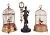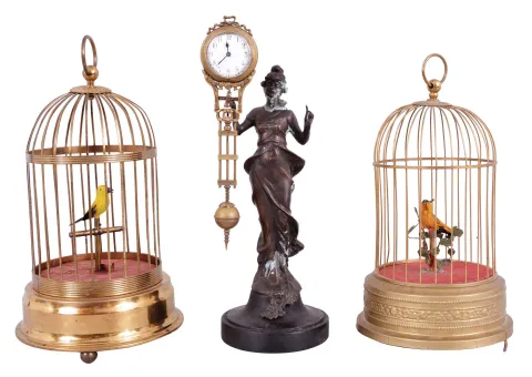 Singing birds- 2 (Two) Singing birds and one swinging mystery clock: German made yellow signing birds in brass cages and one Junghans-style reproduction mystery clock inspired by the "Diana" model. both singing birds show signs of life, but will need mechanical attention. One bird cage is not screwed together and is missing its feet. The mystery clock ticks and swings, but was not tested long term. Female figure with some oxidation around the head and neck. Dimensions are for swinging clock.