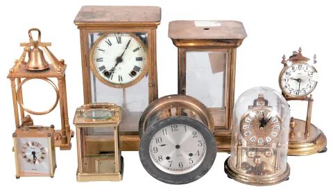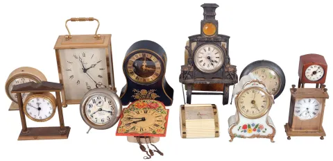 Clocks- 33 (Thirty-three) Alarm Clocks, Desk, and Novelty Clocks: large lot of small clocks by makers including Westclox, Ingraham, Ansonia, Waterbury, Swiza, LeCoultre, and others. Also three brass & glass cases.