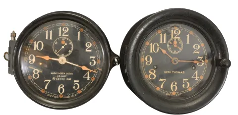 Clocks- 2 (Two) Seth Thomas Marine: (1) Seth Thomas Clock Co., Thomaston, Conn., for U.S. Navy, "Mark I- Deck Clock", 8 day, time only, spring-driven rear-wind movement in a black phenolic case with a hinged bezel, 6 inch black dial with white Arabic numerals, subsidiary seconds, and white spade hands, dated 1942. (2) Seth Thomas Clock Co., Thomaston, Conn., deck clock, 8 day, time only, twin spring-driven movement in a black phenolic case with a hinged bezel, 6 inch black dial with white Arabic numerals, subsidiary seconds, and white spade hands. (1) Black phenoic case has a bit of the typical mottling. Luminous paint on hands and hour marks has darkened. The clock retains its original rear mounting plate. Movement was fitted with an electric wire that has been cut. Movement ticks briskly, but was not tested long term. (2) Case is dirty. Bezel was repainted black some time ago. Luminous paint has darkened. Movement runs, but was not tested long term. Dimensions are for the Mark I Deck Clock. Sold "as is ".