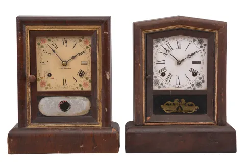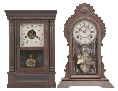Clocks- 4 (Four): (1) Chauncey Jerome, miniature column and cornice clock, 30 hour, time and strike, spring driven movement in a grain painted wood case, c1850; (2) Waterbury Clock Co., "Hastings" mantel clock, 8 day, time and strike, spring driven