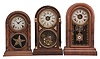 Clocks- 3 (Three): (1) Atkins Clock Co., Bristol, Conn., "Round Top" shelf clock, 8 day, time and strike movement in a rosewood veneered case, c1875; (2) Seth Thomas Clock Co., Thomaston, Conn., "Chicago", 8 day, time and strike with alarm in a rosewood