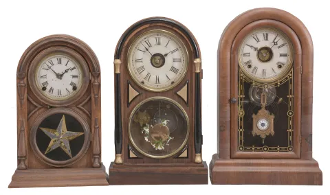 Clocks- 3 (Three): (1) Atkins Clock Co., Bristol, Conn., "Round Top" shelf clock, 8 day, time and strike movement in a rosewood veneered case, c1875; (2) Seth Thomas Clock Co., Thomaston, Conn., "Chicago", 8 day, time and strike with alarm in a rosewood veneered case, c1874; (3) E.N. Welch, "Round Gothic, V.P.", 8 day, time and strike with alarm in a mahogany veneered case, c1885. (1) Veneer lifting on back edge. Some paint loss on metal dial. Colored paint on door glass is faded. Case has been rubbed down. (2) Case partially refinished. Accents on front have been repainted rather poorly. Image on door glass is almost entirely gone. Some paint has flaked off around winding arbor holes. (3) Veneer losses to the front of case. Case rubbed down. Dial worn and touched up. Door will need to be remounted to upper hinge. Correct door glass and pendulum. Hands may be replacements. Dimensions are for the Welch (3) .