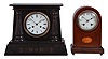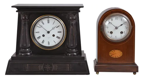 Clocks- 2 (Two): (1) Vincenti & Cie., Paris, mantel clock, 8 day, time and strike, spring driven pendule de Paris movement in a black slate case with Egyptian-style columns, c1880; (2) France, round top mantel clock, 8 day, time and strike, spring driven pendule de Paris movement in a walnut case with inlay, c1910. (1) Case in good condition. White enamel dial signed "McLennan / Glasgow / Paris ". (2) Crack in wood case along the top has been filed. Unsigned movement. Minute hand is a replacement. Dimensions are for the Vincenti (1)