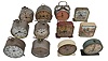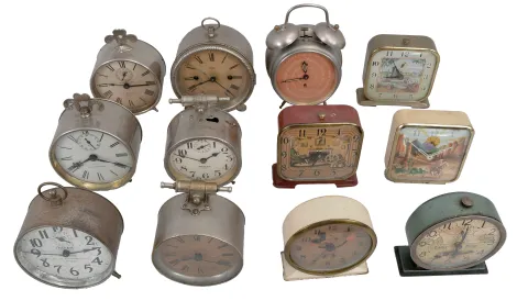 Clocks- 12 (Twelve) Alarm: assortment of antique alarm clocks including several old advertising clocks, two which control gas valves mounted to their tops, a Mickey Mouse clock, and four with simple animated scenes on their dials.