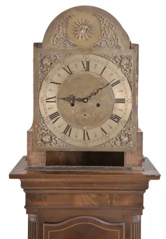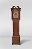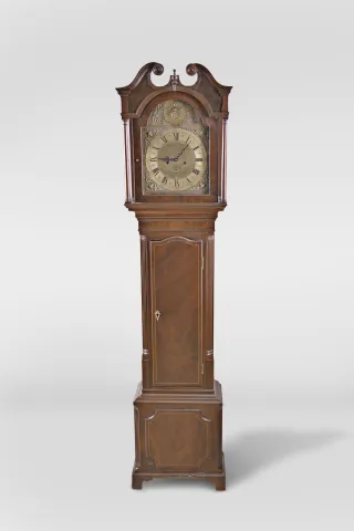 English Tall Clock DIal and Case Only- inlaid mahogany case on straight bracket feet with unsigned brass dial now fitted with quartz movement