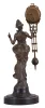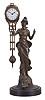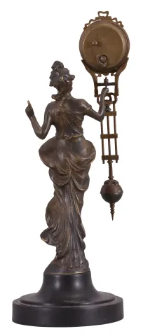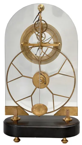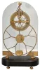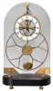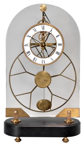Clocks- 2 (Two): Junghans-style reprooduction swinging mystery clock, 3 to 5 days, time only, spring driven movement with compound pendulum held aloft by a female figure, c1990; (2) Oversize great-wheel skeleton clock reproduction, 8 day, spring driven exposed movement mounted to plate glass on a wood base, white enamel chapter ring, c2012. (1) Good reproduction of Junghans "Diana" model swing clock. Dial says "8 Days" which is not usually true of these reproductions. (2) This clock was removed from its original packaging for the first time for this description, so is in "as new" condition. Dimensions are for the swinger (1). Sold "as is ".
