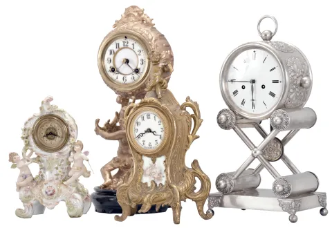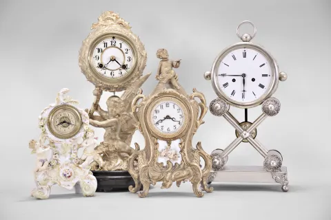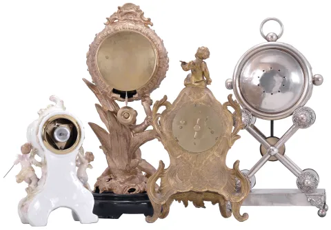 Clocks- 4 (Four): (1) Waterbury Clock Co., Waterbury, Conn., mantel clock, 8 day, time and strike, spring driven movement in a cast metal case featuring a putto holding the clock aloft, cream porcelain dial, 1915; (2) Austria, mantel clock, 2 day, time and strike, spring driven movement in a silver plate-over-copper case with white enamel dial, c1840; (3) Waterbury Clock Co., Waterbury, Conn., novelty clock, 30 hour, time only movement with thread suspension in a cast metal case with painted ceramic panel and topped by putto figure, c1905; (4) Germany, novelty clock, 30 hour, time only, spring driven movement in a porcelain case with putti figures, c1920. Dimensions are for silver plated Austrian clock. Sold "as is ".