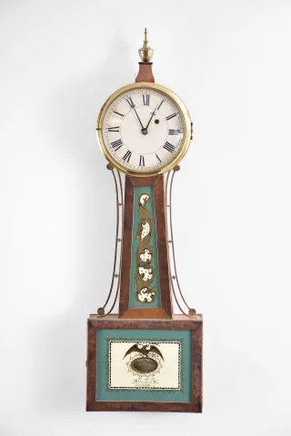 Unknown maker, 8 day, weight brass movement copy of a patent or banjo wall timepiece. Handmade mahogany case in original finish. The case maker apparently used a combination of old and new wood. Zinc dial has some loss and inpainting on the edges, Tablets were painted on old glass.
