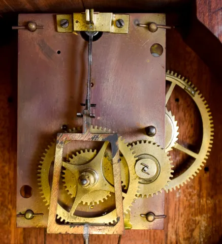 Unknown maker, 8 day, weight brass movement copy of a patent or banjo wall timepiece.