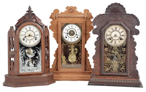 Clocks- 3 (Three): (1) William L. Gilbert Clock Co., Winsted, Conn., "Turret", 8 day, time and strike, spring brass movement shelf clock, c1881 (2) Waterbury Clock Co., Waterbury, Conn., "Mansfield", 8 day, time and strike, spring brass movement shelf