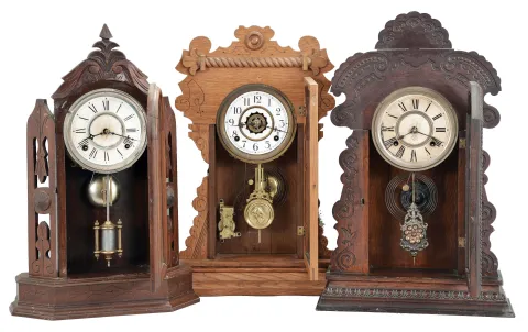 Clocks- 3 (Three): (1) William L. Gilbert Clock Co., Winsted, Conn., "Turret", 8 day, time and strike, spring brass movement shelf clock, c1881 (2) Waterbury Clock Co., Waterbury, Conn., "Mansfield", 8 day, time and strike, spring brass movement shelf clock, c1891 (3) Ansonia Clock Co., New York, "Kenisco", 8 day, time and strike, spring brass movement shelf clock, c1901 (1) Walnut case in original finish. Small finials on each corner are missing. Original paper dial has some light surface stains. Original hands, pendulum and tablet. Clean label on the back. (2) Refinished pressed oak case. Replaced paper dial. Original tablet, hands and pendulum. A small damaged area on the curved top behind the front crest. A furniture store label on the back. (3) Pressed oak case in original finish. A pressed oak ornament is missing on the top crest. Original paper dial has surface wear and poor repairs. Original hands and pendulum.