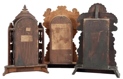 (1) Walnut case in original finish. Small finials on each corner are missing. Original paper dial has some light surface stains. Original hands, pendulum and tablet. Clean label on the back. (2) Refinished pressed oak case. Replaced paper dial. Original tablet, hands and pendulum. A small damaged area on the curved top behind the front crest. A furniture store label on the back. (3) Pressed oak case in original finish. A pressed oak ornament is missing on the top crest. Original paper dial has surface wear and poor repairs. Original hands and pendulum.