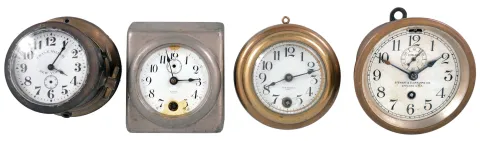 Clocks- 4 (Four) Dash-mounted Timepieces: items include timepiece by Chelsea Clock Co., Boston for Steward & Clark Mfg. Co., Chicago; Chas. E. Miller, New York timepiece in a brass case with enamel dial; New Haven Clock Co., "New Ormond" 8 day, timepiece