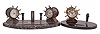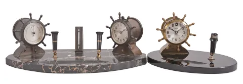 Clocks- 2 (Two): (1) Waterbury Clock Co., Waterbury, Conn., "Desk Set No. 1", 8 day, time only, spring driven jeweled movements in a yacht wheel form metal case on a black onyx base with pen holder, c1929; (2) Waterbury Clock Co., Waterbury, Conn., "Desk Set No. 3", 8 day, time only, spring driven jeweled movements in a yacht wheel form case on a black marble base with pen holder, thermometer, and barometer, c1929 Both sets are in overall good condition. When the yacht wheel is turned the clock is wound. If the wheel is turned while a lever on the top of the case is lifted, the hands can be rotated to the desired time. Originally, the sets came with Sheaffer pens, but none are included with this lot. Dimensions are for the Desk Set No. 3.