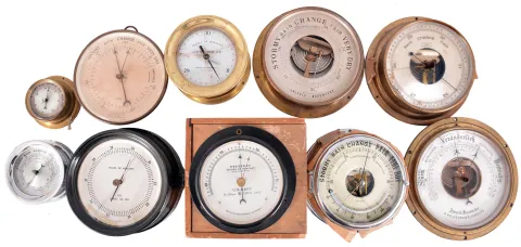 Barometers- 10 (Ten) Barometers: French, German, and American made aneroid barometers, some with thermometers by makers such as Selsi, M. Low, Fee & Stemwedel, G. Hechelmann, Kenyon, Abercrombie & Fitch, and Admiralty.