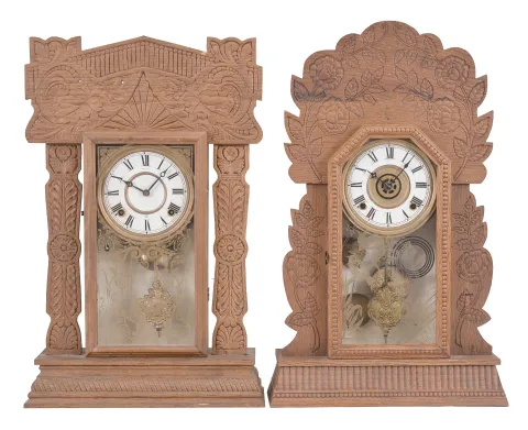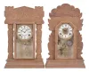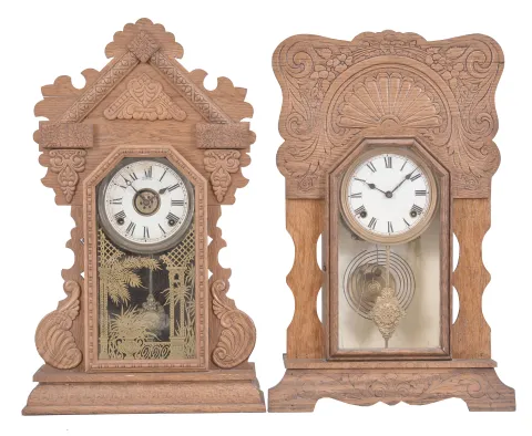 Clocks- 4 (Four) Gingerbread, 8 day, time and strike, spring driven movements in oak cases: (1) E. Ingraham, Bristol, Conn., "Atlantic" mantel clock, time and strike, c1915; (2) Wm. L. Gilbert Clock Co., "Navy No. 26" mantel clock, time and strike with