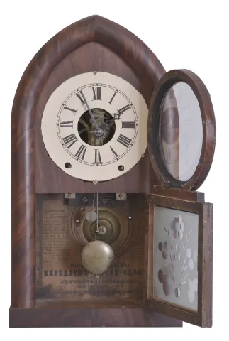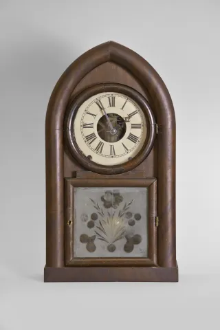 Brewster & Ingrahams, Bristol, Conn., 8 day, time and strike spring brass movement round gothic or beehive shelf clock with rack and snail strike and case iron spring barrels. Mahogany veneered case in an old finish has a chip on the base, small loss at the top door hinge, small damaged spot on the top back edge and some shrinkage cracks at the top door. Replaced hands. Original painted dial now has a paper dial glued over it and poorly aligned. Original acid etched and cut glass tablet.