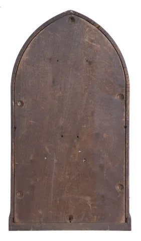 Mahogany veneered case in an old finish has a chip on the base, small loss at the top door hinge, small damaged spot on the top back edge and some shrinkage cracks at the top door. Replaced hands. Original painted dial now has a paper dial glued over it and poorly aligned. Original acid etched and cut glass tablet.