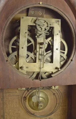 Brewster & Ingrahams, Bristol, Conn., 8 day, time and strike spring brass movement round gothic or beehive shelf clock with rack and snail strike and case iron spring barrels.