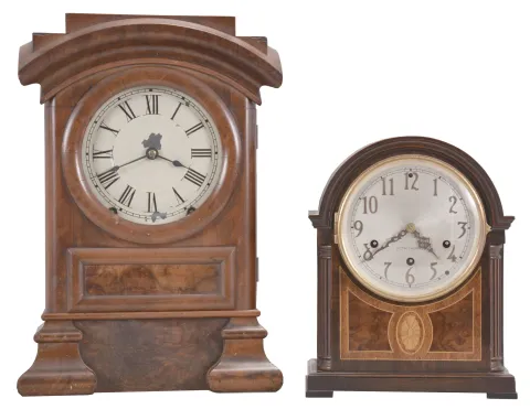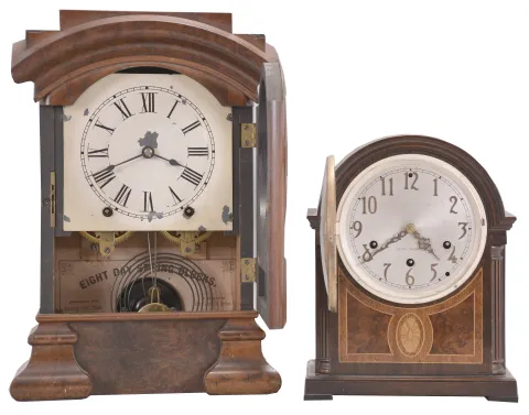 Clocks- 2 (Two): (1) Seth Thomas Clock Co., Thomaston, Conn., "Arch Top", 8 day, time and strike spring brass movement shelf clock. c1880 (2) Seth Thomas Clock Co., Thomaston, Conn., "Chime Clock No. 96", 8 day, time, strike, and chime on 4 rods spring brass movement mantel clock. c1928 (1) Walnut and burl walnut veneered case in original finish has a small chip on the bottom corner, small piece at the back of the top molding and a couple small spots on the top front. Original painted dial has scattered loss. Original hands. Clean label inside. (2) Inlaid mahogany case in nice condition in original finish. Original silvered dial has some light surface scratches at the winding arbors. Original hands.