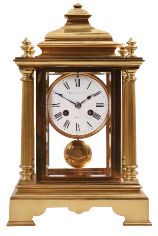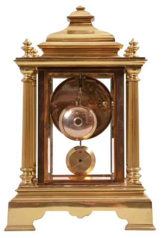 Marshall and Sons, Paris, crystal regulator, 8 day, time and strike, spring-driven pendule de Paris movement in a polished brass architectural case with four fluted columns and four beveled glasses, white enamel dial with Roman numerals and blued steel spade hands. brass case is in very good condition. Beveled glasses are fine. Dial has a few hairlines and a repaired break below the right winding arbor. Retailer name is a bit hard to read. The pendulum stamped with same number as the movement. The movement is loose on one side. Movement ticks and strikes, but was not tested long term.