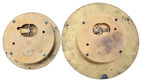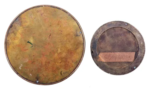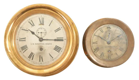 The U.S. Shipping Board existed from 1916 to 1934 to encourage American commercial shipping. Both clocks have good quality round Seth Thomas 7 jewel movements. The smaller clock has a heavy brass case with a dark patina. The dial of the smaller clock has considerable tarnish and some residue from a paper dial that was applied over it for a time. The hands are somewhat bent. The larger brass case is lighter in weight and retains some of the original bright finish with some scratches and spots. The larger clock dial also has some tarnish around the winding arbor hole. Both clocks tick. Dimensions are for the larger of the two clocks.