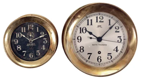 Clocks- 2 (Two) Seth Thomas Marine: (1) Seth Thomas Clock Co., Thomaston, Conn., for U.S. Navy, "Deck Clock No. 2", 8 day, time only, spring-driven balance wheel movement in a brass case with screw-on bezel, 4.5 inch black metal dial with subsidiary