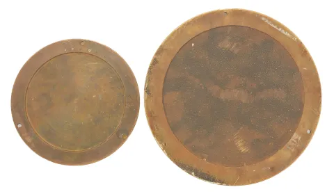 (1) Brass case is in fair conditon with some of the lacquer starting to form dark spots. Glass is cracked in two. Black dial is dirty and the luminous paint has become very dark. Back of case is stamped by Chelsea. Movement ticks when wound. (2) Brass case is good with a nice patina. Silvered dial is also good with a light amount of tarnish spots on the right side. Movement ticks briskly, but was not tested long term. Dimensions are for the larger of the two clocks. Sold "as is ".