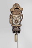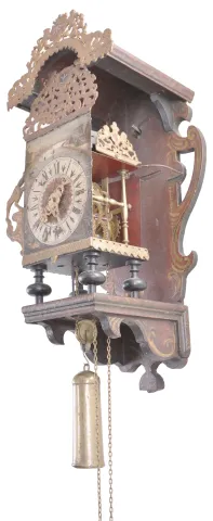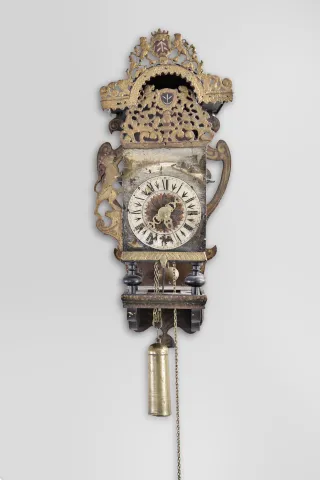 Netherlands, Frisian stoelklok, 30 hour, time and strike, weight driven movement with verge escapement, the clock resting on a polychrome painted shelf with scrolled decorations and lead ornaments with crowned lions, Roman numeral painted metal dial with landscape painting above, and pierced brass hands. Case with simpler-than-usual painted design is quite attractive. One side ornament and dust shied will need to be reinstalled. One of the lead lion ornaments has cracked through the middle. Lead ornament above the dial has a broken top. Good brass clad weight and pendulum. Though the hour hand has the marking for an alarm, the clock is not equiped with an alarm mechanism. The crowned lion is likely a symbol of the Dutch Republic.