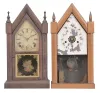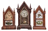 Clocks- 5 (Five): (1) New Haven Clock Co., "No. 251" mantel clock, 30 hour, time only in a zebra veneered case, c1886; (2) E.N. Welch, miniature sharp gothic mantel clock, 30 hour, time and alarm in a mahogany veneer case, c1870; (3) W.L. Gilbert, "Small