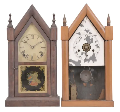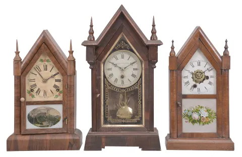 Clocks- 5 (Five): (1) New Haven Clock Co., "No. 251" mantel clock, 30 hour, time only in a zebra veneered case, c1886; (2) E.N. Welch, miniature sharp gothic mantel clock, 30 hour, time and alarm in a mahogany veneer case, c1870; (3) W.L. Gilbert, "Small Sharp Gothic", 8 day, time and strike in a rosewood veneer case, c1879; (4) E.N. Welch, sharp gothic mantel clock, 8 day, time and strike in a rosewood veneer case, c1860; (5) E.N. Welch, sharp gothic mantel clock, 30 hour, time and strike with alarm in pine case, c1860; (1) Finials are not original. Modern pendulum. (2) Nice inner label. (3) Some veneer loss. Nice inner label. Dial discolored. (4) Original finish is dark. Nice table with patriotic eagle motif. (5) Case veneer has been stripped. Finials are replacements. No pendulum. Door is included by not shown in photo. Dial flaking badly. Dimensions are for clock (4) .