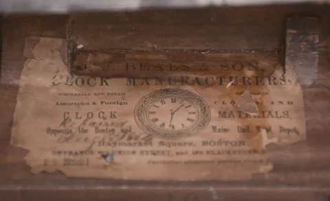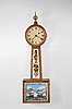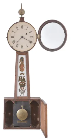 Massachusetts, Possibly a North Attleboro maker, 8 day, weight brass movement patent or banjo timepiece retailed by J. J. Beals & Son, Boston. Mahogany and mahogany veneered case in an old finish has veneer damage on the bottom door and throat frame. The throat sides have some damage on the edge from prior use of screws to attach the throat frame to the case. Wood door bezel has a repair at the hinge. Bottom panel shows some damage from the weight. Original painted dial has some loss on the edge and poor repairs to the numbers. Hands and tablets are not original. Original paper label inside.