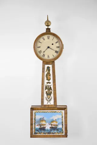 Massachusetts, Possibly a North Attleboro maker, 8 day, weight brass movement patent or banjo timepiece retailed by J. J. Beals & Son, Boston.