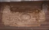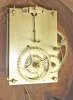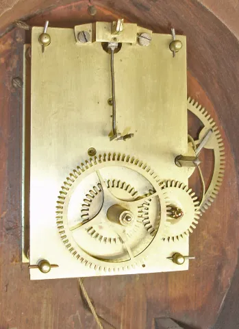 Mahogany and mahogany veneered case in an old finish has veneer damage on the bottom door and throat frame. The throat sides have some damage on the edge from prior use of screws to attach the throat frame to the case. Wood door bezel has a repair at the hinge. Bottom panel shows some damage from the weight. Original painted dial has some loss on the edge and poor repairs to the numbers. Hands and tablets are not original. Original paper label inside.